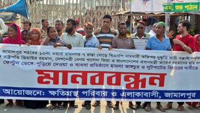 জামালপুরে প্রধানমন্ত্রীর ছবি সম্বলিত ফেস্টুন পোড়ানোসহ ব্যবসা প্রতিষ্ঠানে হামলার প্রতিবাদে মানববন্ধন
